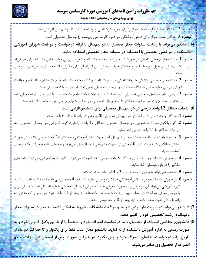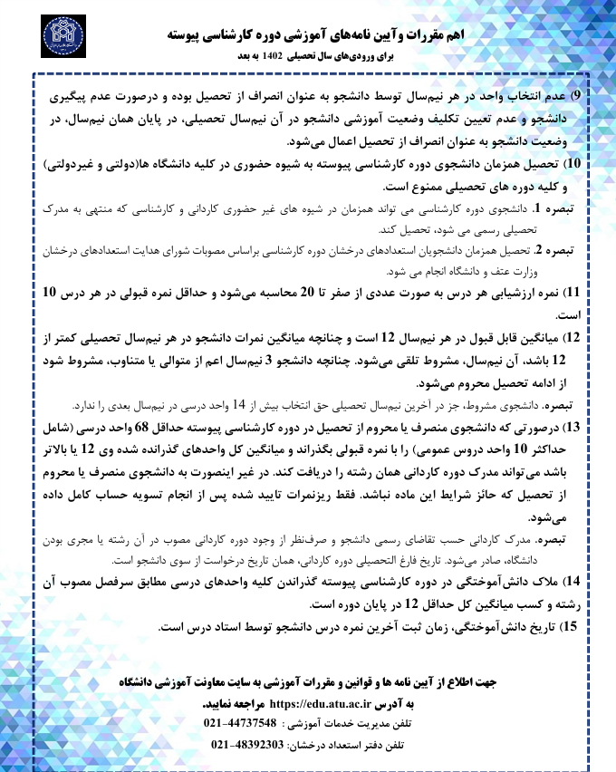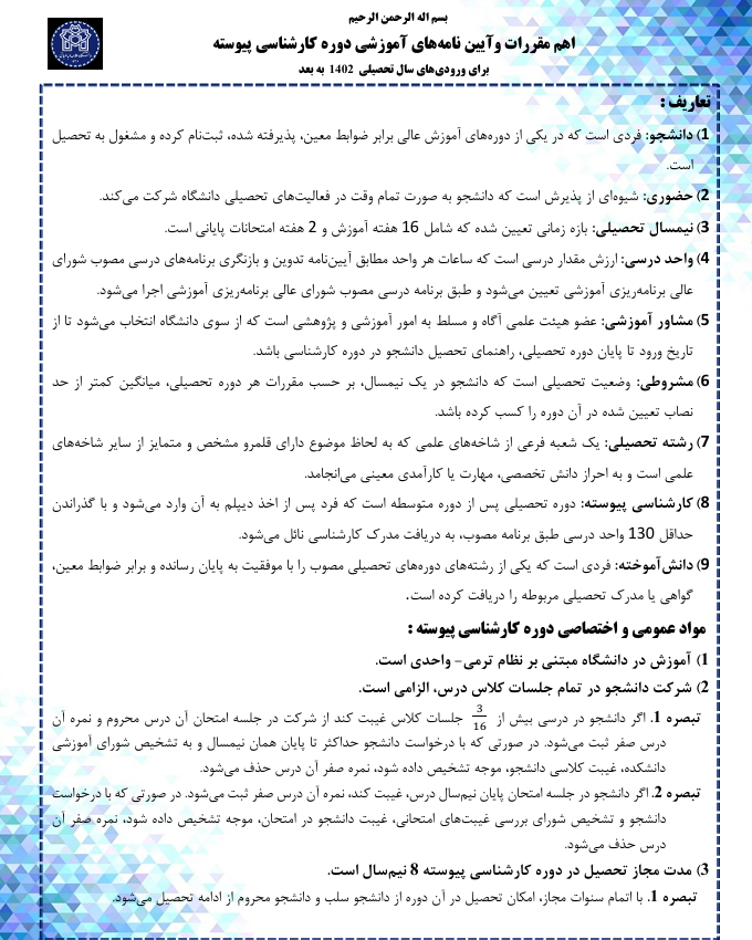 اهم مقررات وآیین نامه¬های آموزشی دوره کارشناسی پیوسته برای ورودی های سال تحصیلی ۱۴۰۲ به بعد ۱۶ مهر ۱۴۰۴ | ۰۸:۳۰ کد : ۳۰۲۵۰ اخبار آموزشی ارسال به دیگران نام شما ایمیل شما ایمیل دریافتکننده ارسال انصراف تعداد بازدید:۱۳
